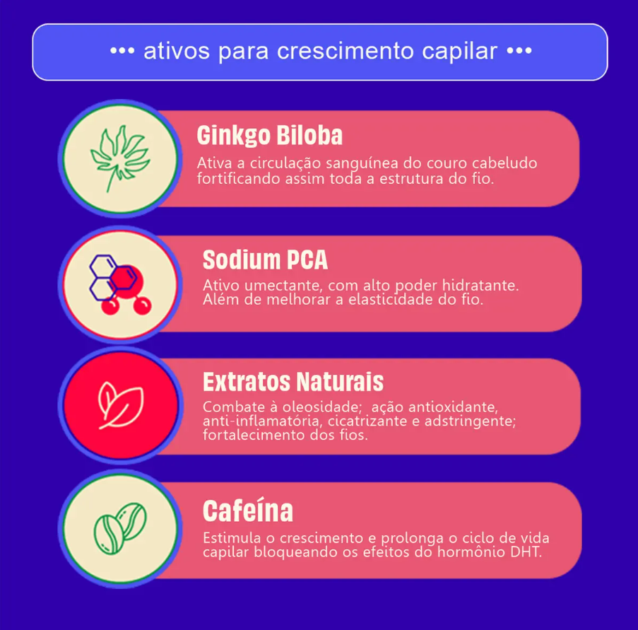 Este tónico de uso contínuo estimula o crescimento saudável, reforça o folículo capilar e fortalece a raiz, ajudando a prolongar o ciclo natural dos fios.